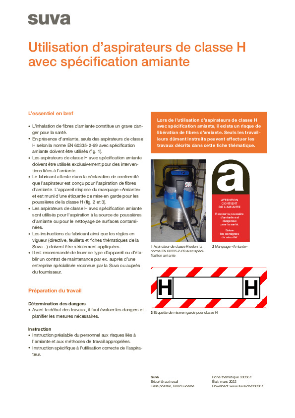 Dès qu’un travail est effectué en présence d’amiante, il existe un risque que des fibres d’amiante soient inhalées, ce qui peut entraîner de graves maladies. Un aspirateur spécifique est donc un outil indispensable. Ce type d’appareil aspire la poussière d’amiante nocive à la source et nettoie les surfaces contaminées. Dans la plupart des cas, il est opportun de louer un aspirateur spécial amiante. Lors de l’utilisation d’un tel appareil, vous devez néanmoins respecter certaines règles pour éviter les dangers pour vous-même et pour les autres: Cette fiche thématique expose les préparatifs permettant de poser les fondements d’un travail sûr et les techniques de travail pertinentes. Après l’utilisation d’un aspirateur de classe H pour l’amiante, certaines prescriptions particulières s’appliquent pour le nettoyage et l’évacuation des déchets. Vous pouvez remplacer les sacs à filtre à l’air libre, mais à cette fin, vous devez toujours porter votre EPI. Cette opération est superflue si vous utilisez un appareil de location. C’est également le cas pour la maintenance de l’aspirateur spécial amiante, qui doit être contrôlé chaque année par un spécialiste. Pour plus d’informations sur ce matériau dangereux, nous vous invitons à consulter notre page Amiante.