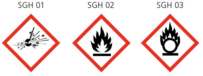 Il s’agit notamment de travaux avec des substances et des préparations pouvant provoquer un incendie ou libérant des gaz, vapeurs ou poussières pouvant former une atmosphère explosible dangereuse. En font également partie les travaux avec des substances et des préparations dotées des symboles de danger ci-après.