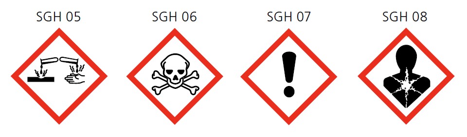 et microorganismes des groupes 2, 3 et 4 conformément à l’art. 3 al. 2 OPTM et les poussières contaminées par des agents biologiques. Il s’agit aussi de travaux avec des substances et des préparations classées comme toxiques, sensibilisantes, cancérogènes, mutagènes ou reprotoxiques selon les phrases H (pour «hazard» en anglais = danger) et/ou dotées des symboles de danger ci-après.